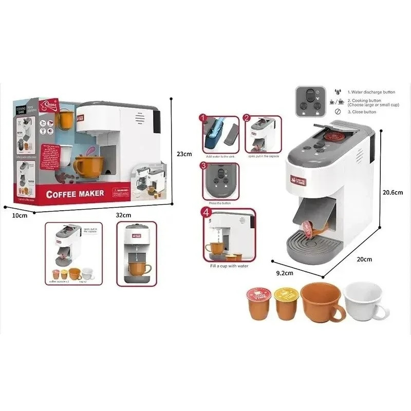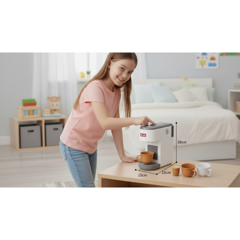 See mängukohvimasin täiendab suurepäraselt laste kööki ja annab võimaluse avada oma väike kohvik — kõik vajalik on olemas: kohvimasin,