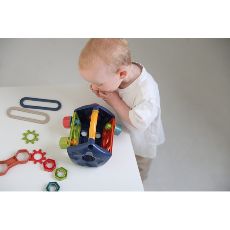 Tolo BIO erksavärviline ja lõbus tööriistakomplekt väikestele meisterdajatele! Komplekti kuulub 14 erinevat osa, sealhulgas kruvikeeraja, mutrivõti, pikad ovaalsed ühendusdetailid, kruvid, poldid, mutrid ja hammasrattad. Mugav sang, millest kinni hoides saab laps kõiki tööriistu mugavalt kaasas kanda.